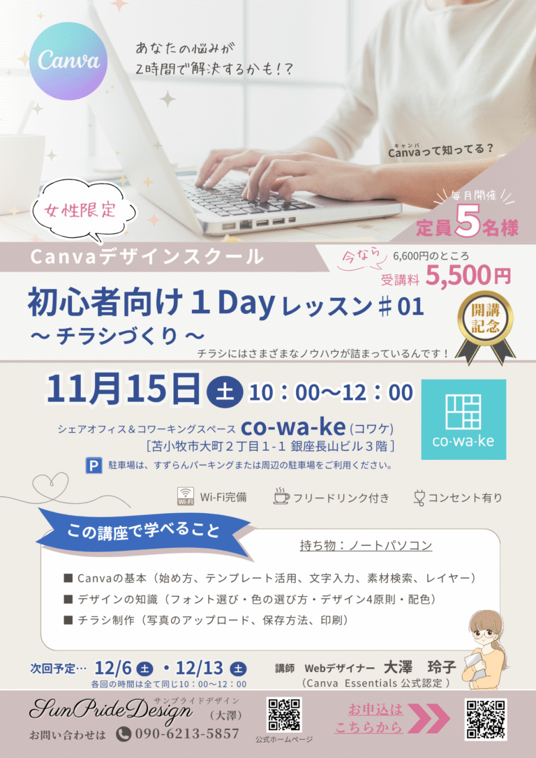 この講座は、Canvaに興味のある女性限定の1dayレッスンとなってます